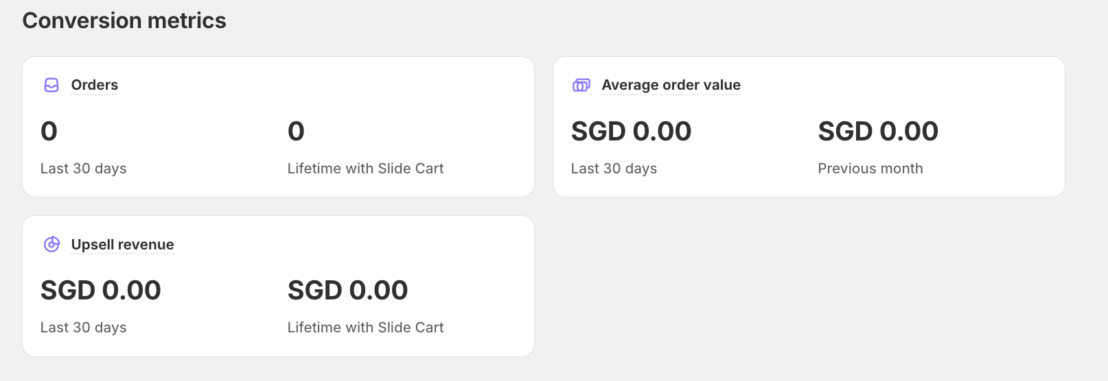 - Discount Codes Applied: The number of times discount codes were successfully applied through Slide Cart. Stacked discounts are counted as well.