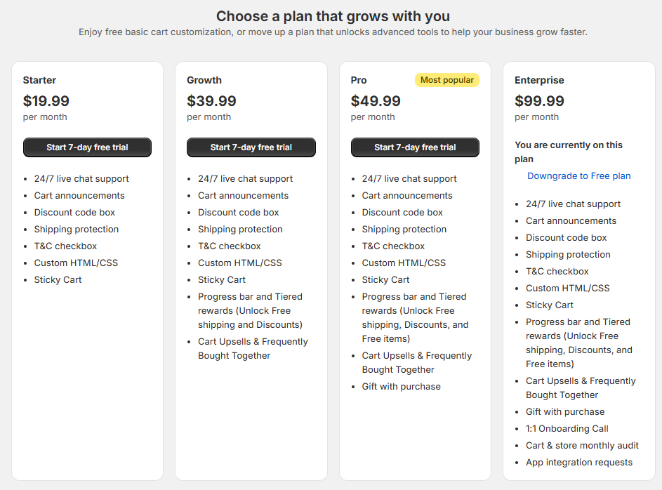 The available plans are Starter, Growth, Pro, and Enterprise. Starter serves as the entry-level plan, and each subsequent tier builds on it by offering more advanced capabilities, enabling you to scale and optimize your cart experience.