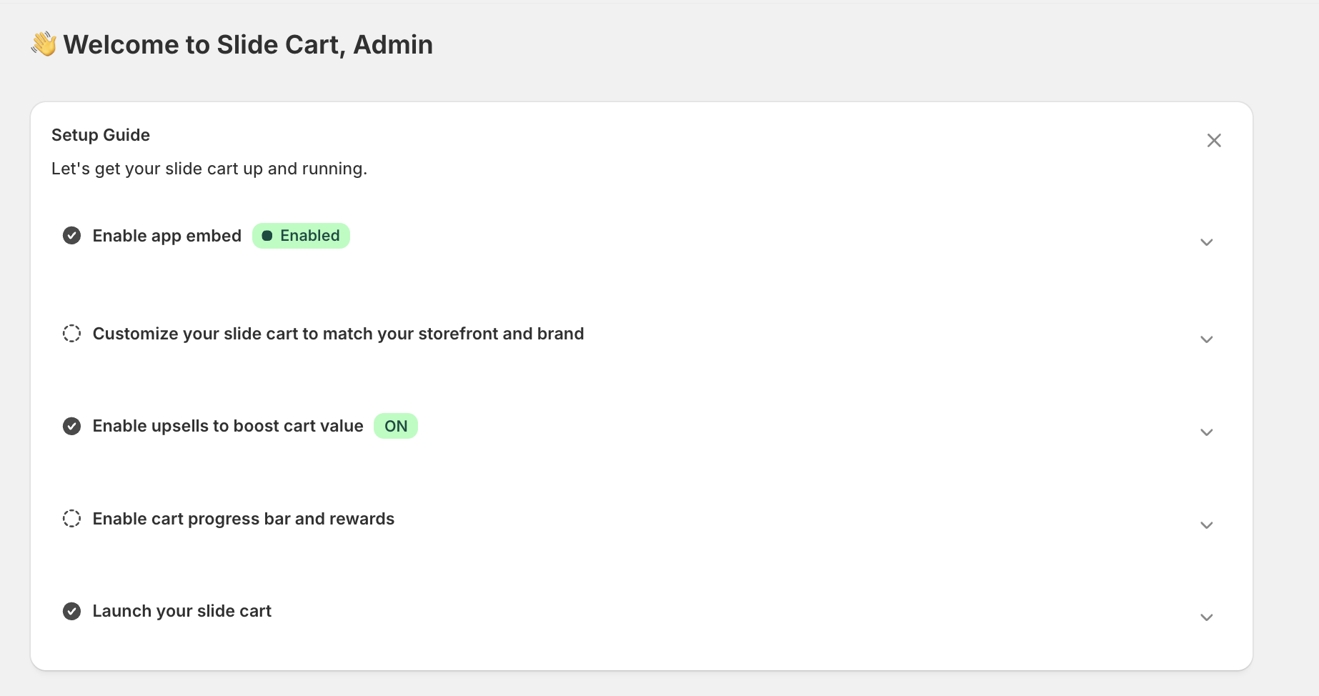 After installing Slide Cart in your store, you can get the app up and running in just a few simple clicks.
