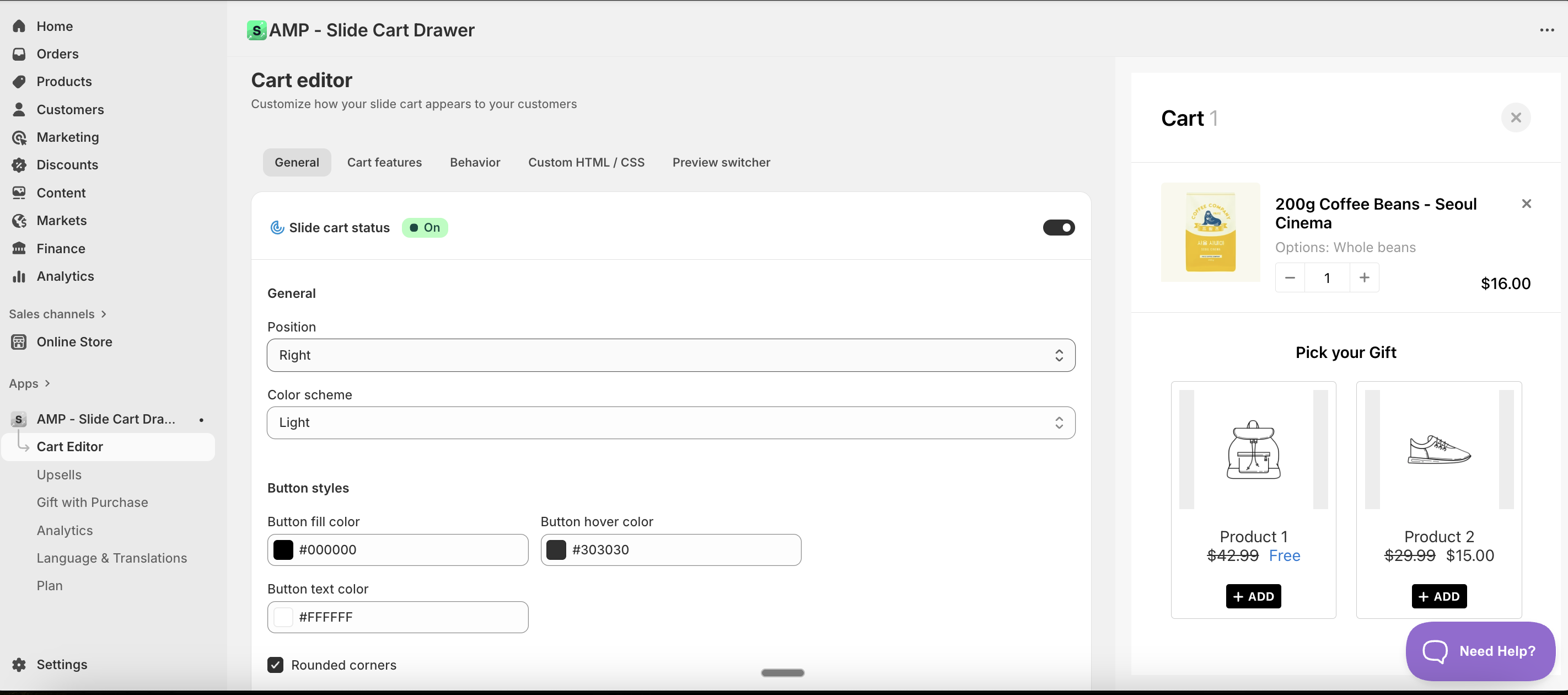 You're all ready to explore Slide Cart. We give you multiple options where you can set up the appearance of the cart first, and then add features that will help you showcase upsells or gifts with the outcome of improving your average order value.