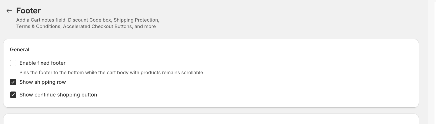 Our app offers the option to add a Continue shopping link below the checkout button in all plans. When clicking the link, the cart will be closed so your customers can continue navigating the current page they are on.