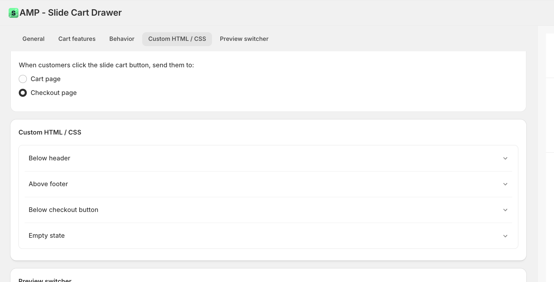To do so, on Slide Cart's dashboard, go to -> Cart Editor -> Custom HTML/CSS and look for the Below checkout button field:
