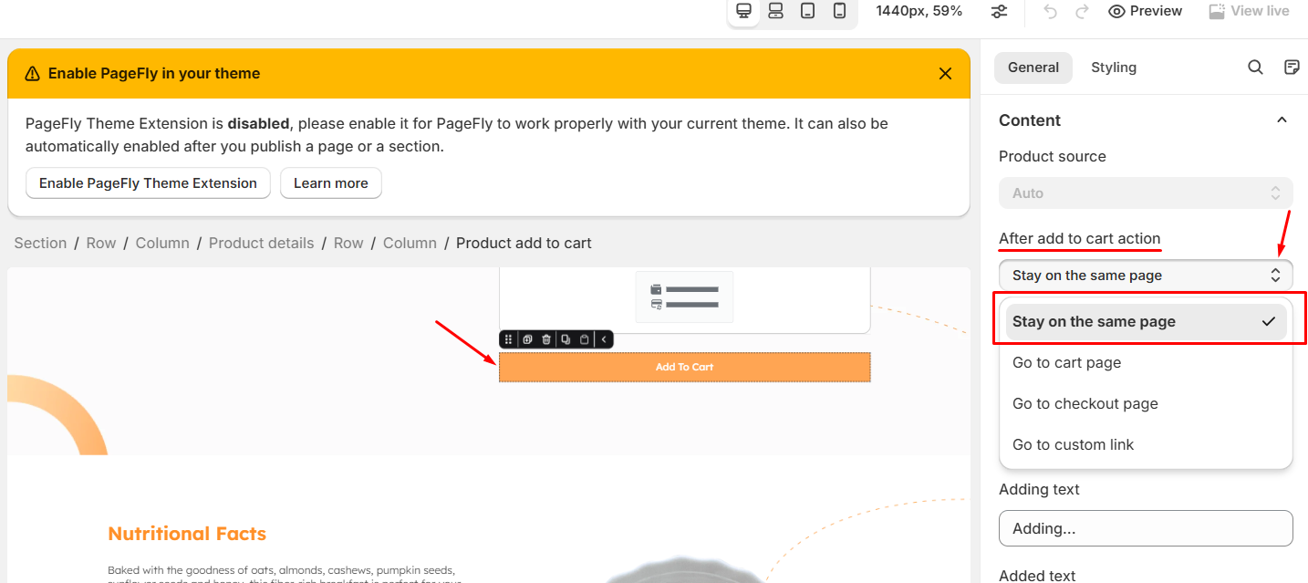 To do this, navigate to PageFly dashboard-> Pages-> Select the product-> Click the add to cart button-> And under the After add to cart dropdown Select Stay on the same page.