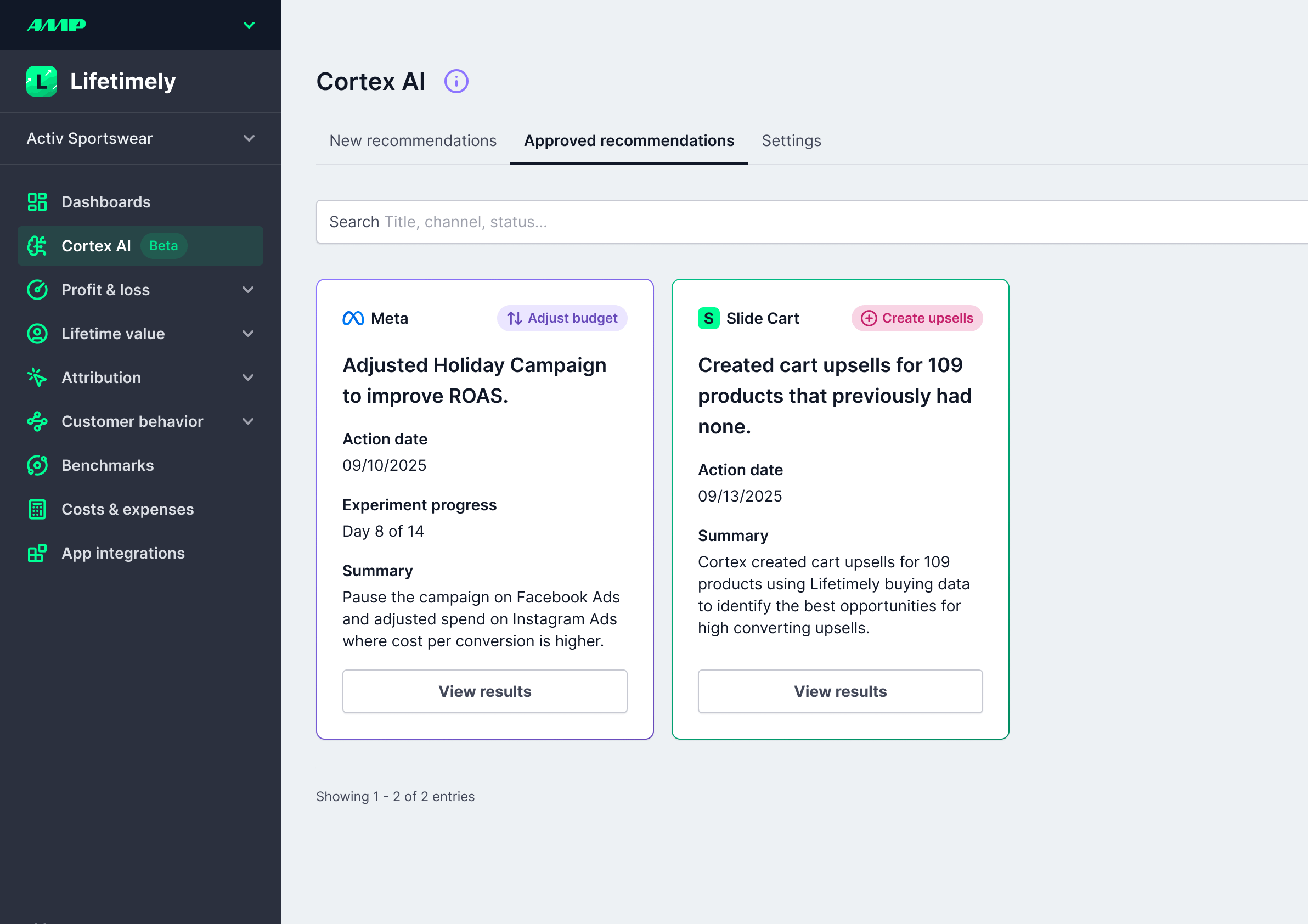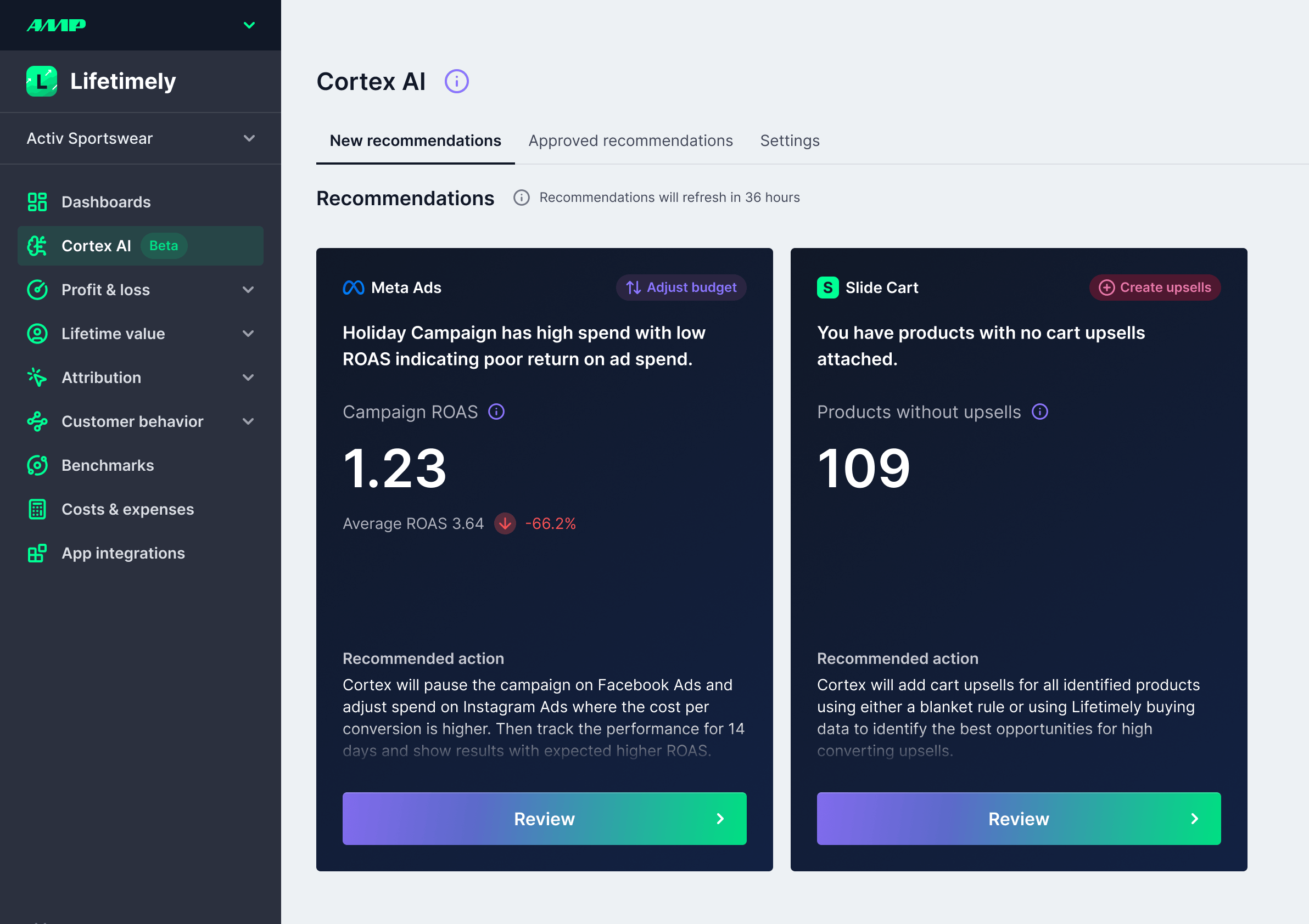 Once you install Lifetimely by AMP, Cortex AI analyzes data from your connected channels to generate tailored recommendations. Once you approve a recommendation, Cortex AI automates the changes directly in the connected system (e.g., adjusting ad campaign budgets on Meta or creating new upsells in Slide Cart).