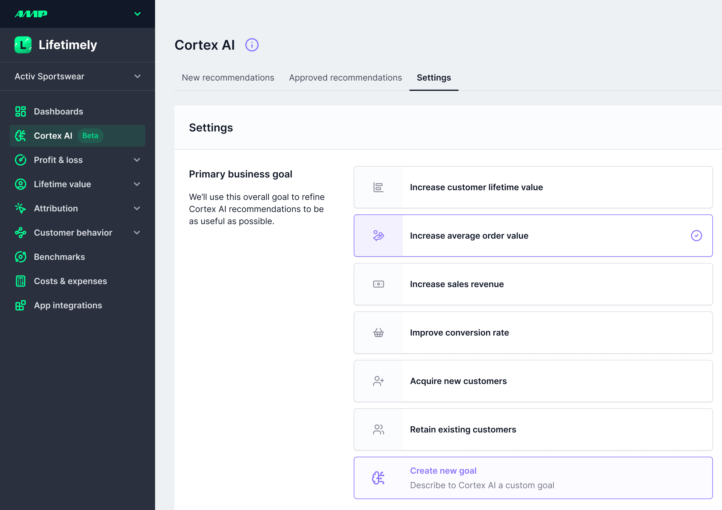 - Cortex AI: An AI-powered capability from Lifetimely that analyzes your business data to recommend and automate improvements.