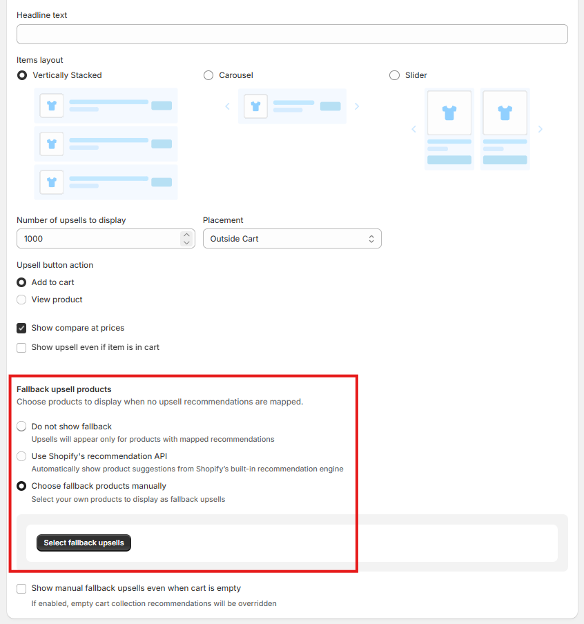 Note: Fallback upsells only apply to products that do not have a specific (condition-based) upsell assigned. If a product does have a specific upsell configured, it will take priority over the fallback upsells.