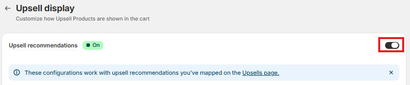 Once there, you will see the text “Upsell Recommendations” with a toggle on the right-hand side that controls its activation.