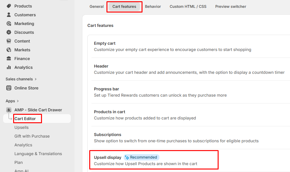 You can access the first block, responsible for enabling the feature, by navigating to Slide Cart Dashboard → Cart Editor → Cart Features → Upsell Display.